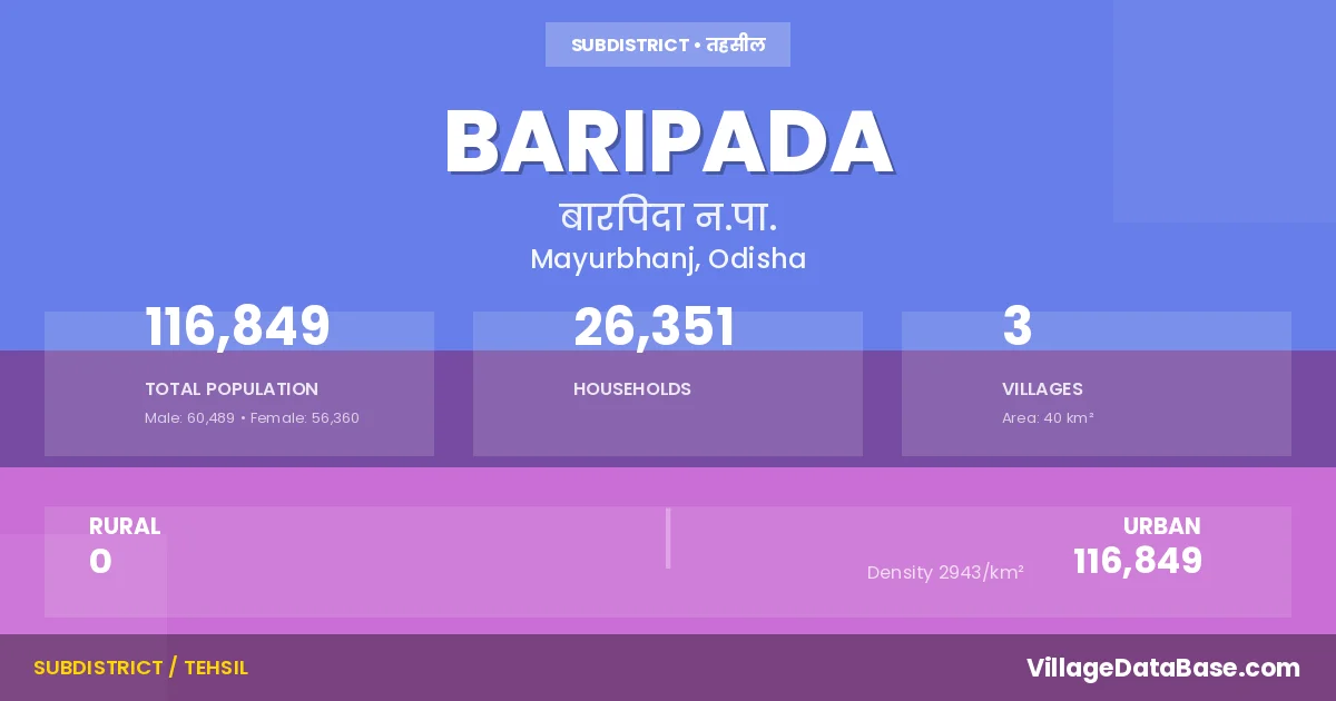 According to the 2011 census The total area of Baripada Tehsil is 40 km², with a population of 116849 people. The population density is 2,943 inhabitants per square kilometre, and there are approximately 26351 houses in the sub district.