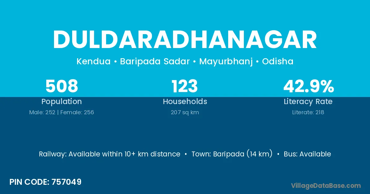 Baripada (14 km) is the nearest town to Duldaradhanagar village for major economic activities and is located approximately 14 km away.