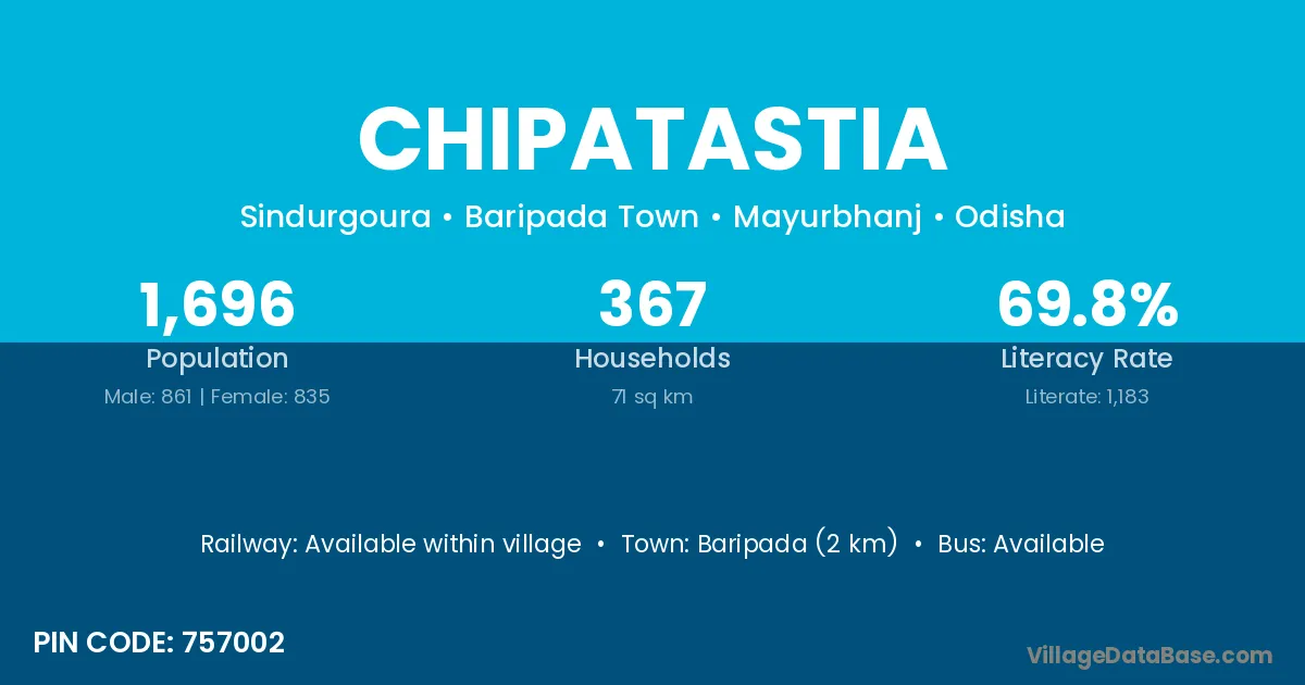 Baripada (2 km) is the nearest town to Chipatastia village for major economic activities and is located approximately 2 km away.