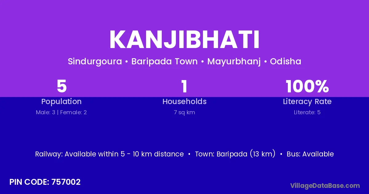 Baripada (13 km) is the nearest town to Kanjibhati village for major economic activities and is located approximately 13 km away.