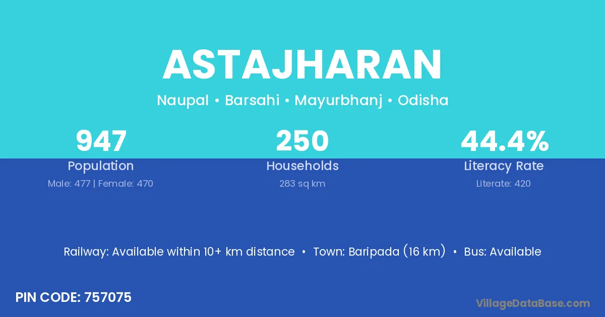 Astajharan village has a total population of 947 people, of which 477 are males and 470 are females.