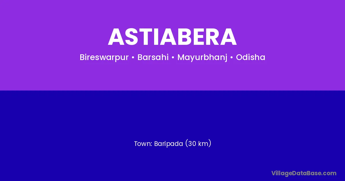 Baripada (30 km) is the nearest town to Astiabera village for major economic activities and is located approximately 30 km away.