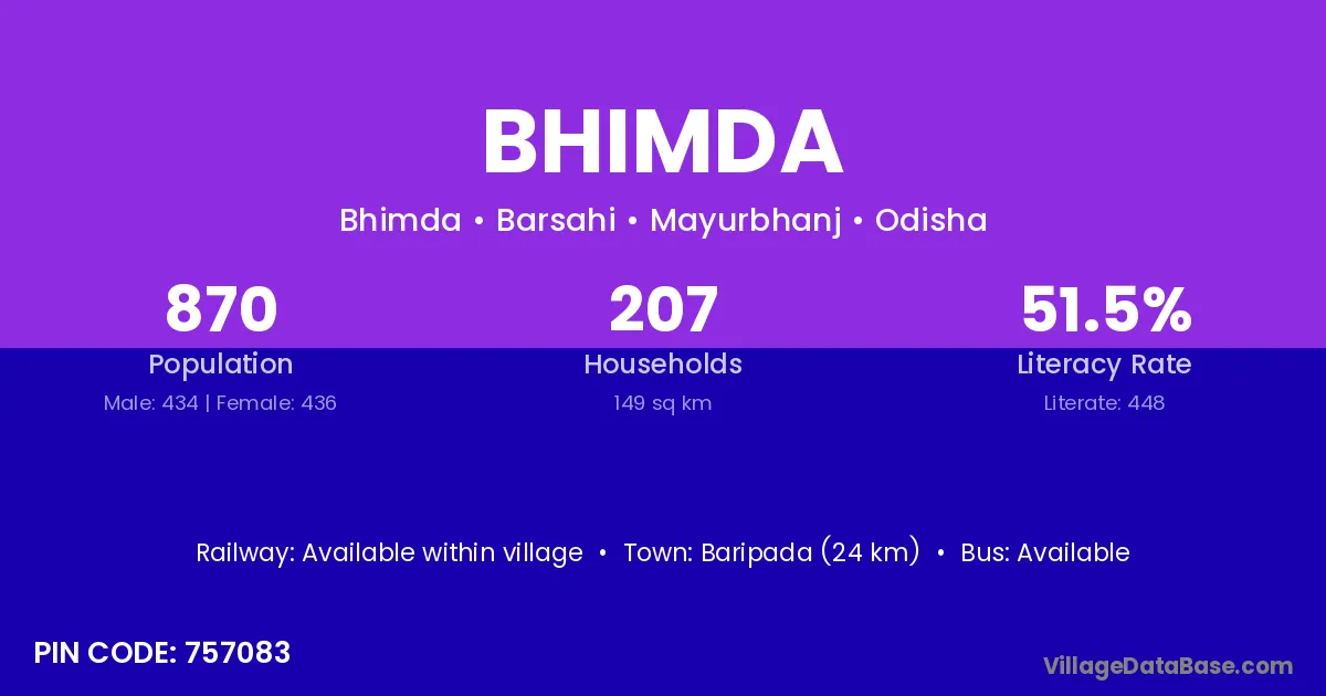 Baripada (24 km) is the nearest town to Bhimda village for major economic activities and is located approximately 24 km away.