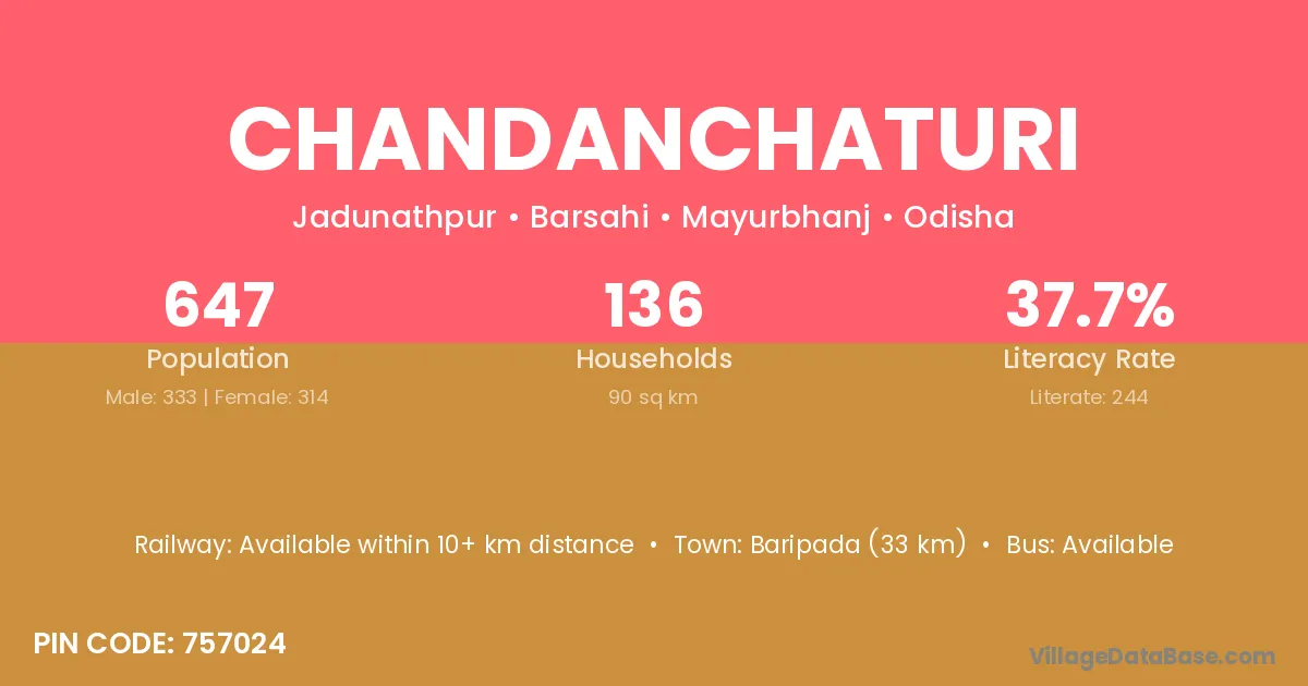 Baripada (33 km) is the nearest town to Chandanchaturi village for major economic activities and is located approximately 33 km away.