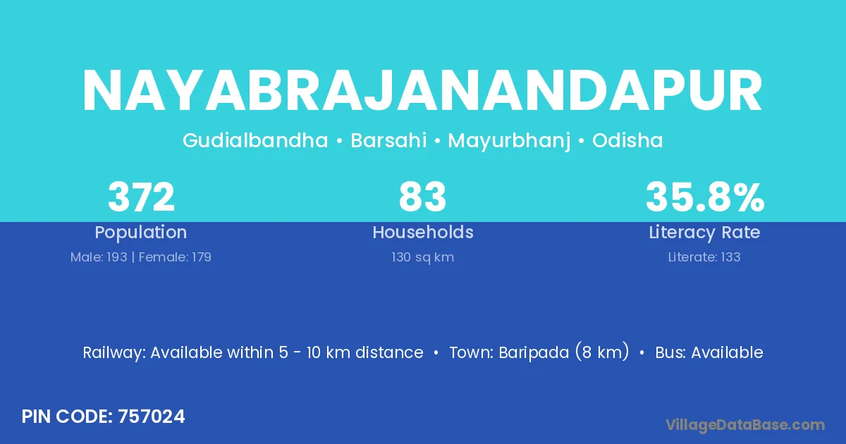 Baripada (8 km) is the nearest town to Nayabrajanandapur village for major economic activities and is located approximately 8 km away.