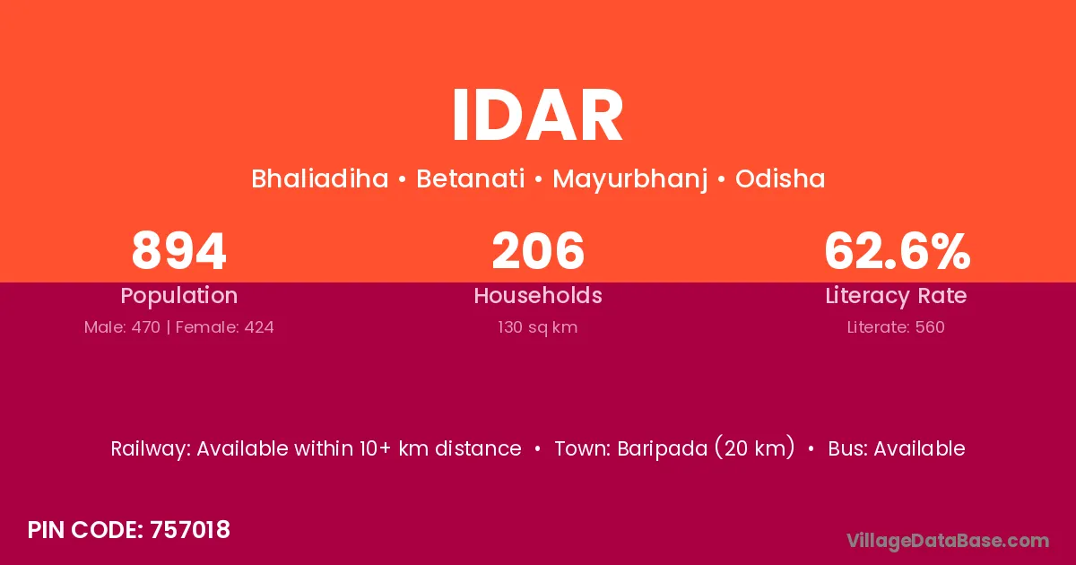 Baripada (20 km) is the nearest town to Idar village for major economic activities and is located approximately 20 km away.