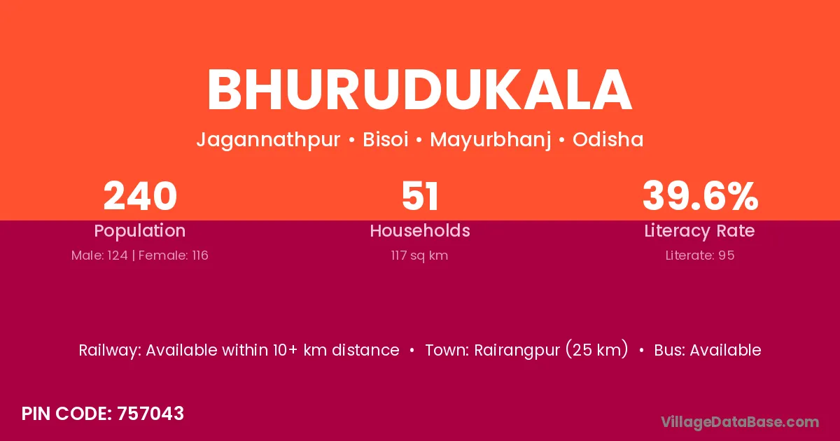 Rairangpur (25 km) is the nearest town to Bhurudukala village for major economic activities and is located approximately 25 km away.