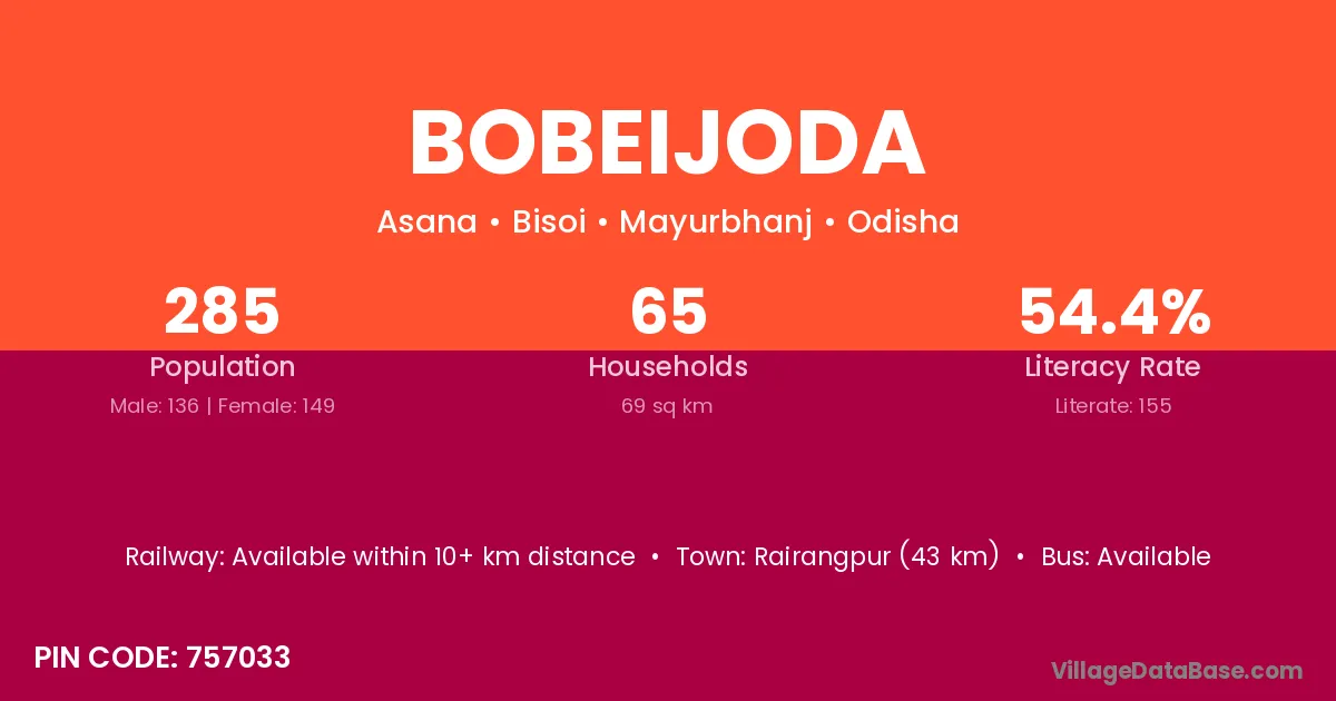 Rairangpur (43 km) is the nearest town to Bobeijoda village for major economic activities and is located approximately 43 km away.