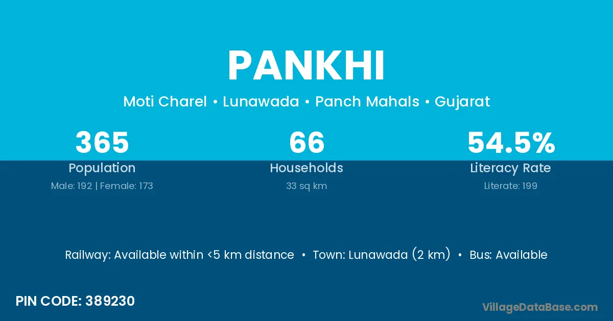 Pankhi village has a total population of 386 people, of which 180 are males and 206 are females.