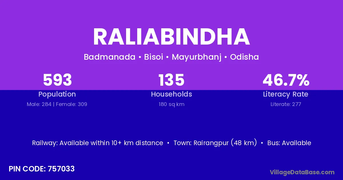 Rairangpur (48 km) is the nearest town to Raliabindha village for major economic activities and is located approximately 48 km away.