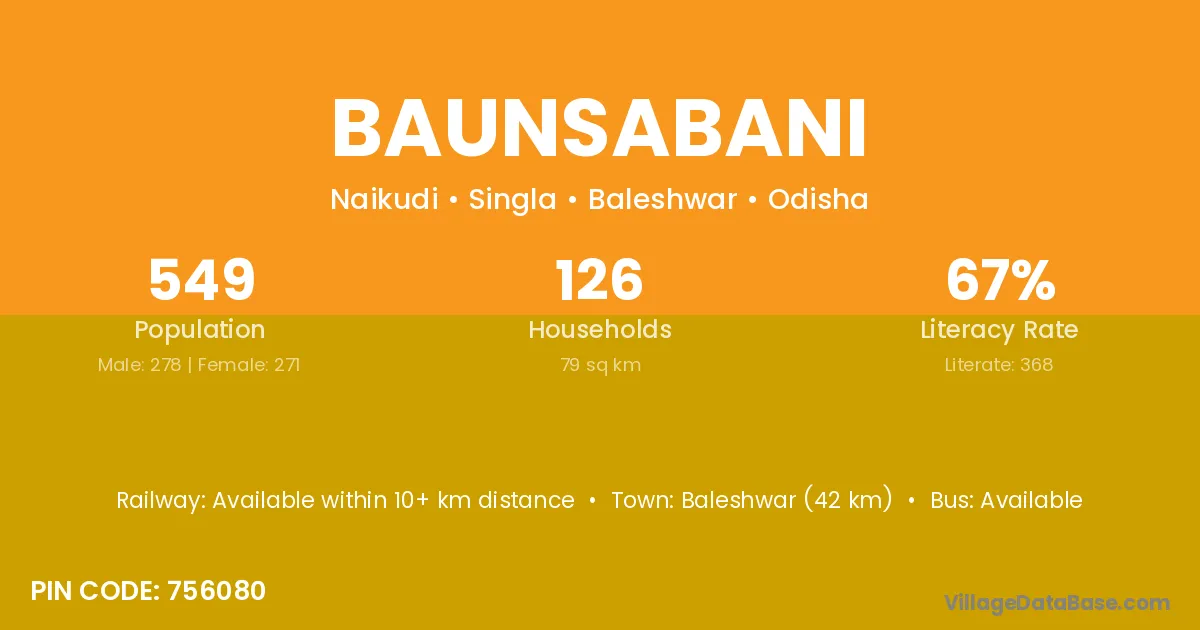 Baripada (25 km) is the nearest town to Baunsabani village for major economic activities and is located approximately 25 km away.
