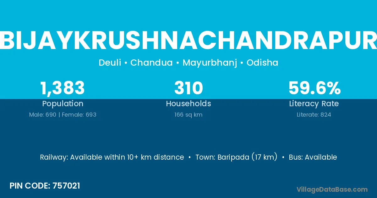 Bijaykrushnachandrapur village has a total population of 1,383 people, of which 690 are males and 693 are females.