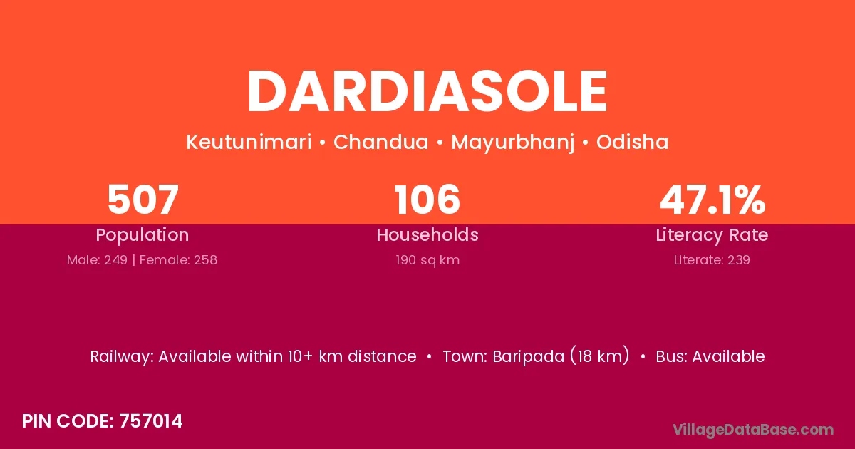 Baripada (18 km) is the nearest town to Dardiasole village for major economic activities and is located approximately 18 km away.