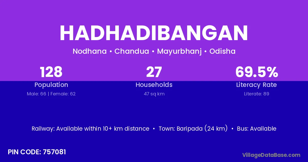 Baripada (24 km) is the nearest town to Hadhadibangan village for major economic activities and is located approximately 24 km away.