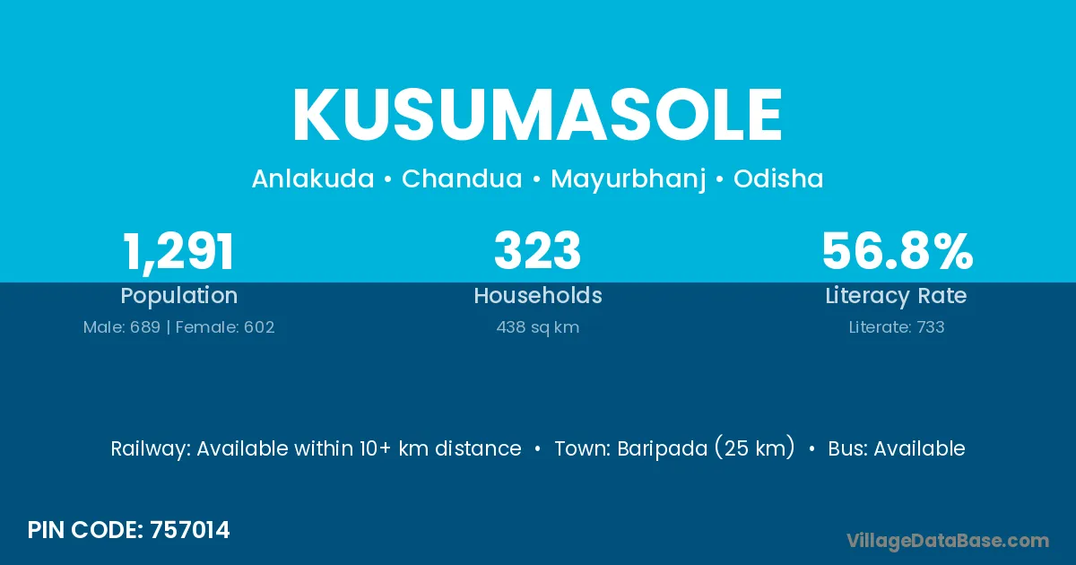 Baripada (25 km) is the nearest town to Kusumasole village for major economic activities and is located approximately 25 km away.
