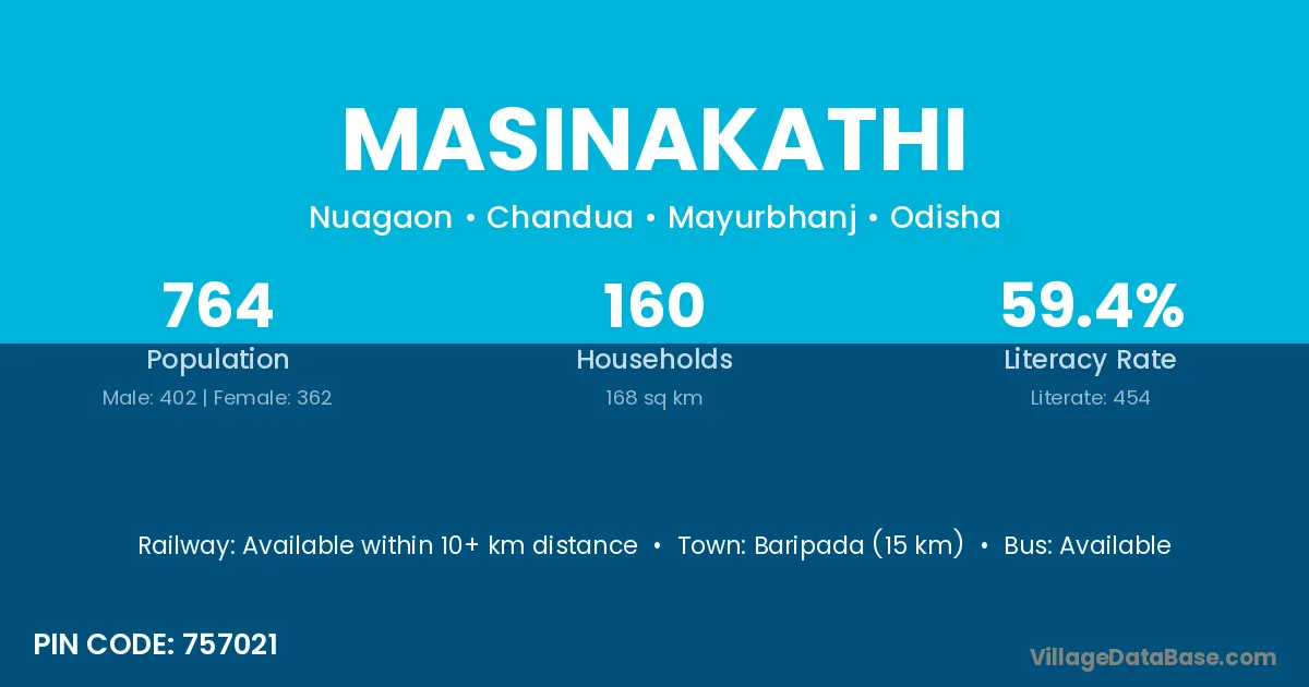 Baripada (15 km) is the nearest town to Masinakathi village for major economic activities and is located approximately 15 km away.