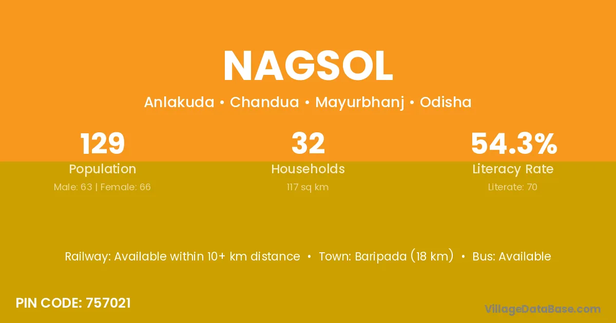 Baripada (18 km) is the nearest town to Nagsol village for major economic activities and is located approximately 18 km away.