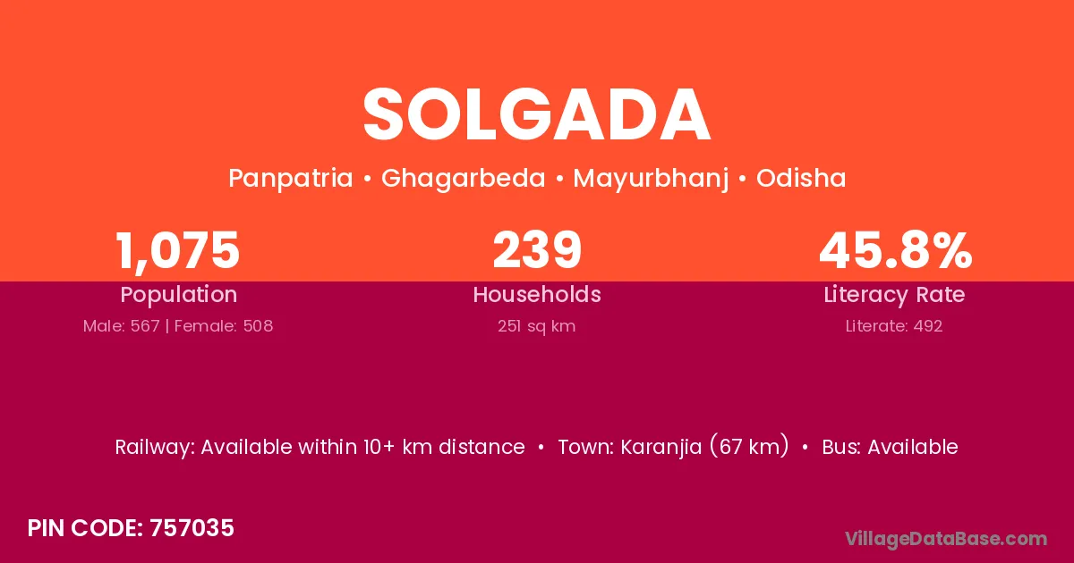 Karanjia (67 km) is the nearest town to Solgada village for major economic activities and is located approximately 67 km away.