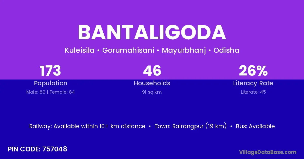 Rairangpur (19 km) is the nearest town to Bantaligoda village for major economic activities and is located approximately 19 km away.