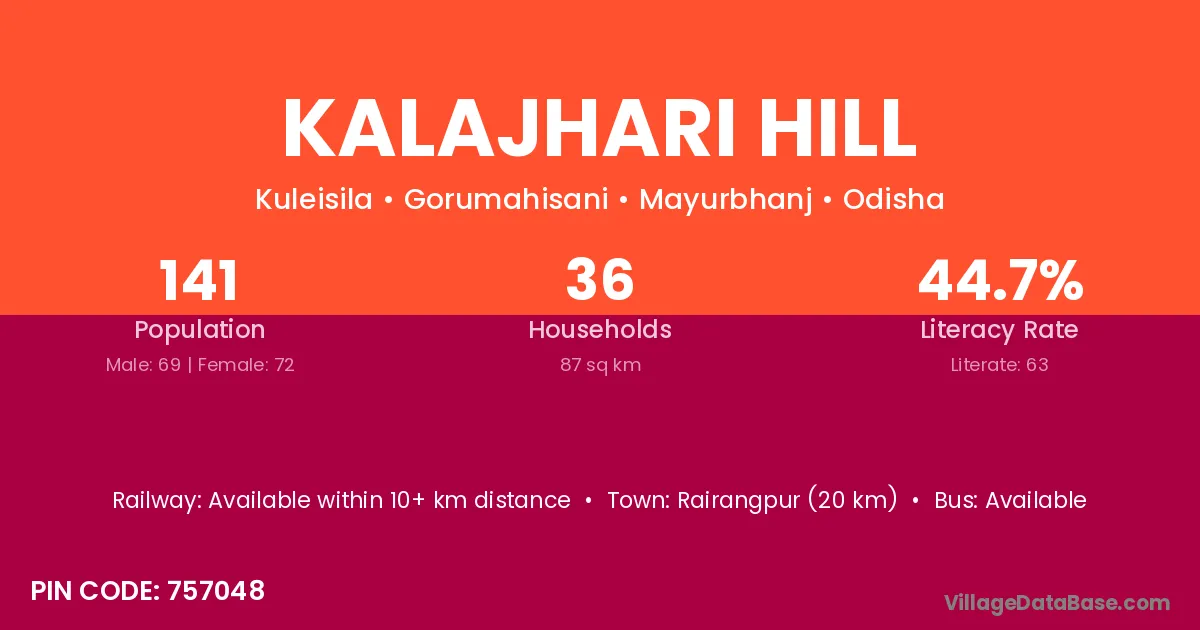 Rairangpur (20 km) is the nearest town to Kalajhari Hill village for major economic activities and is located approximately 20 km away.