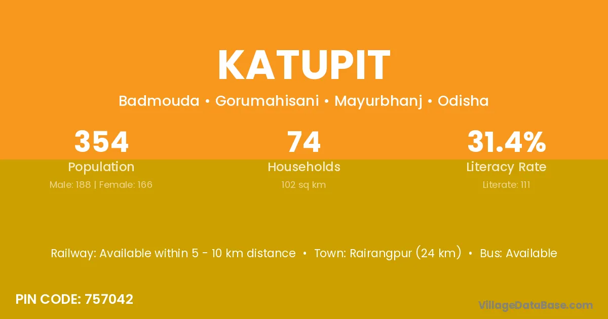 Rairangpur (24 km) is the nearest town to Katupit village for major economic activities and is located approximately 24 km away.
