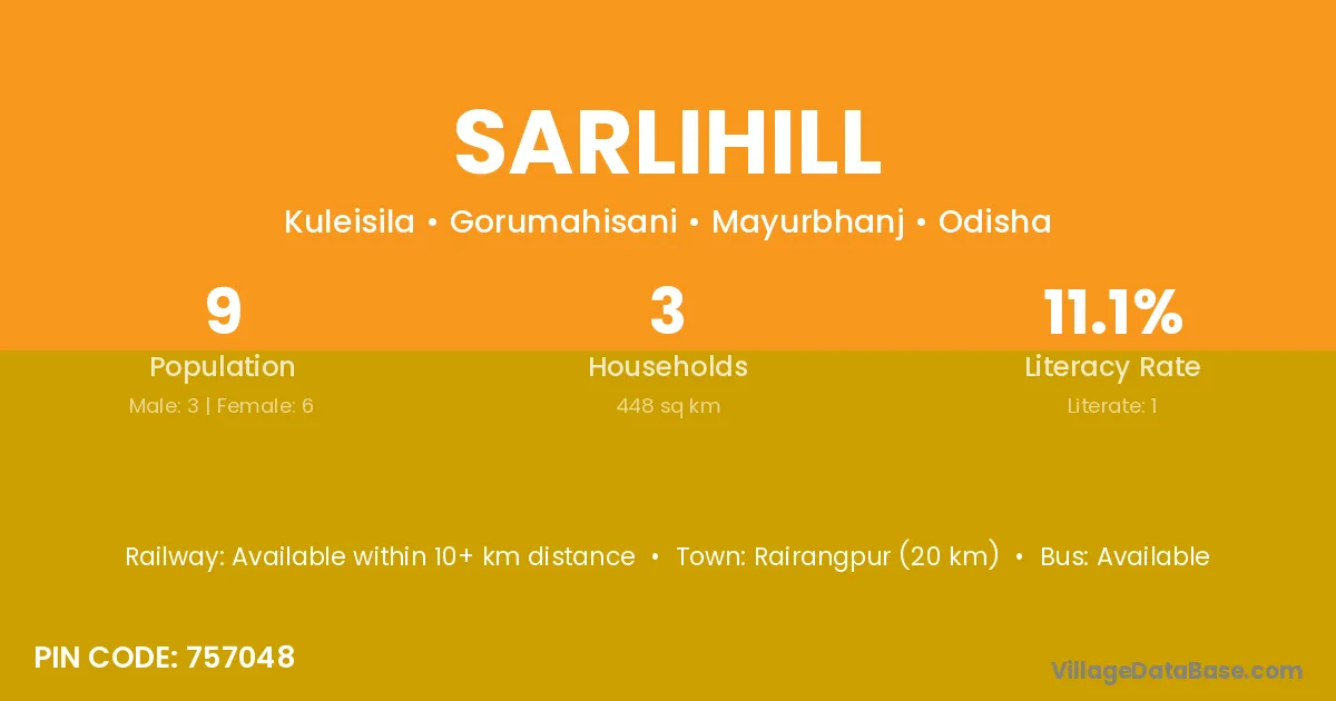 Rairangpur (20 km) is the nearest town to Sarlihill village for major economic activities and is located approximately 20 km away.