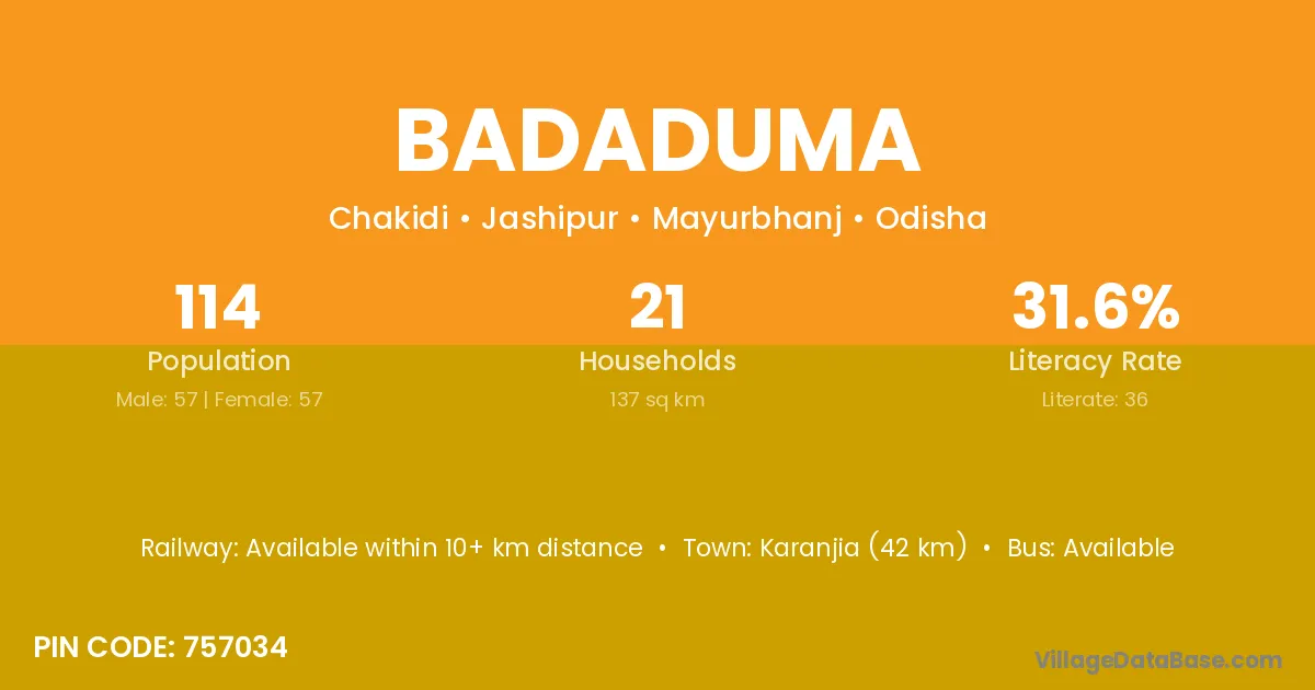 Karanjia (42 km) is the nearest town to Badaduma village for major economic activities and is located approximately 42 km away.
