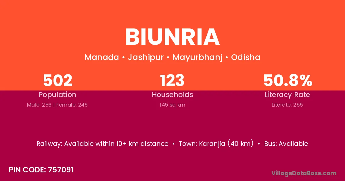Karanjia (40 km) is the nearest town to Biunria village for major economic activities and is located approximately 40 km away.