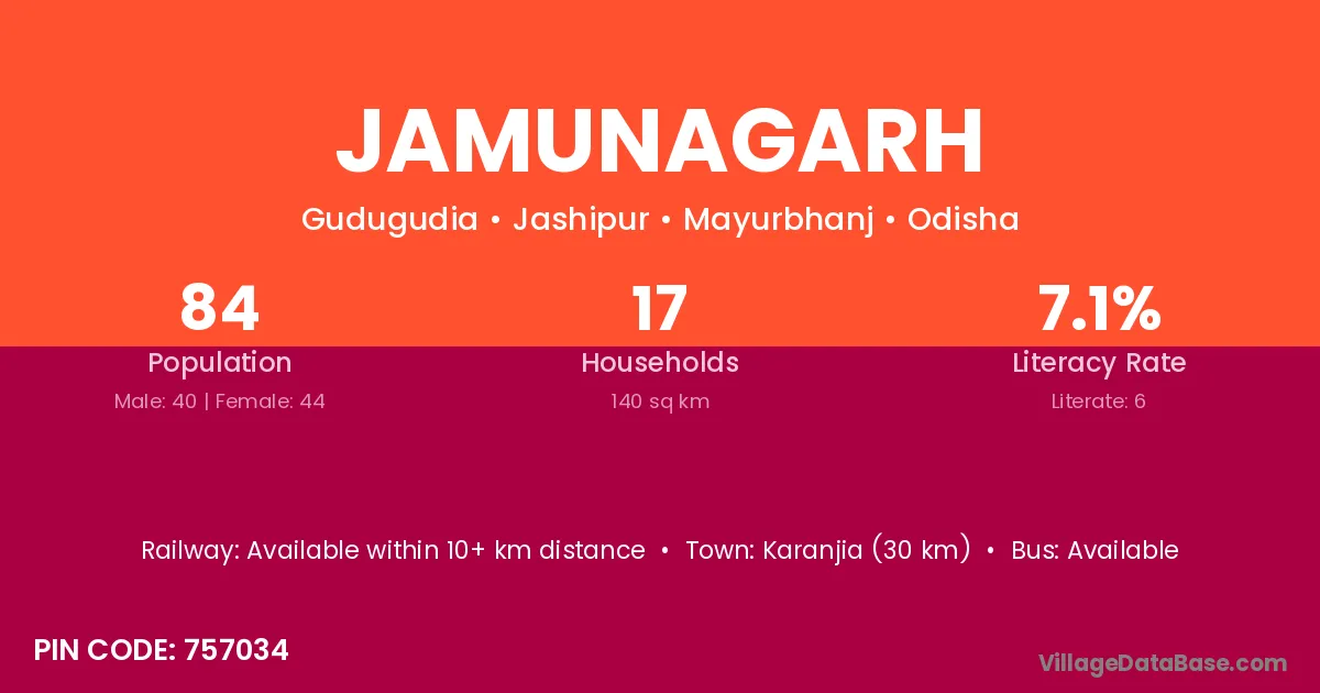 Jamunagarh village has a total population of 84 people, of which 40 are males and 44 are females.