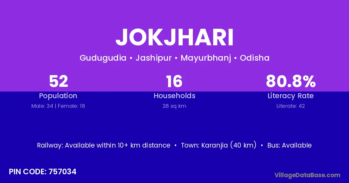 Karanjia (40 km) is the nearest town to Jokjhari village for major economic activities and is located approximately 40 km away.