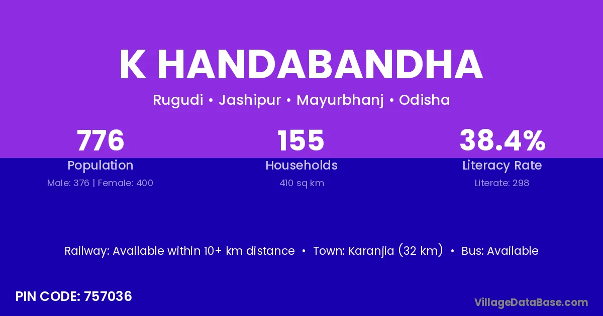 Karanjia (32 km) is the nearest town to K Handabandha village for major economic activities and is located approximately 32 km away.