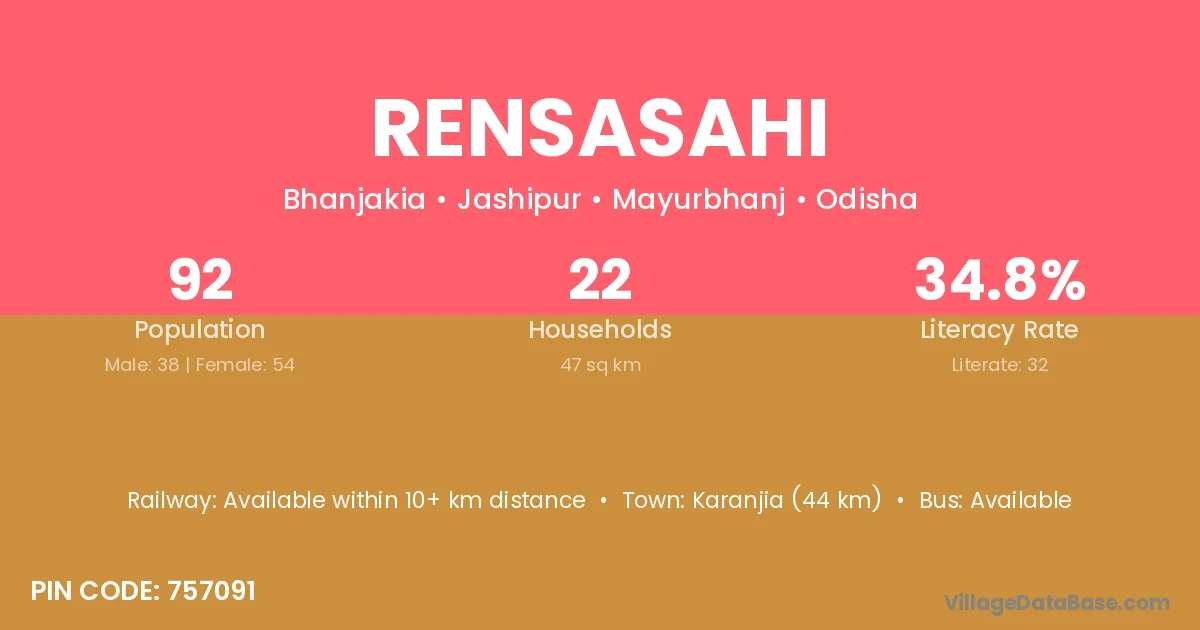 Karanjia (44 km) is the nearest town to Rensasahi village for major economic activities and is located approximately 44 km away.