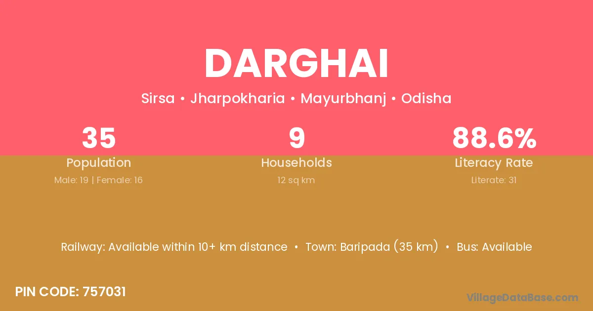 Baripada (35 km) is the nearest town to Darghai village for major economic activities and is located approximately 35 km away.