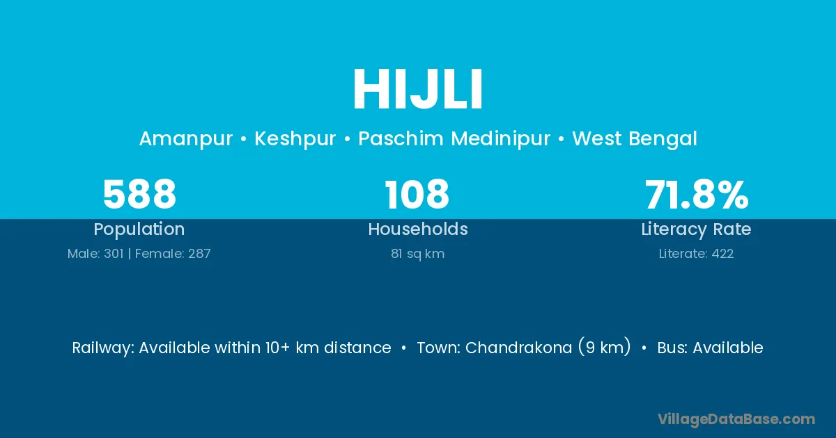 Baripada (35 km) is the nearest town to Hijli village for major economic activities and is located approximately 35 km away.