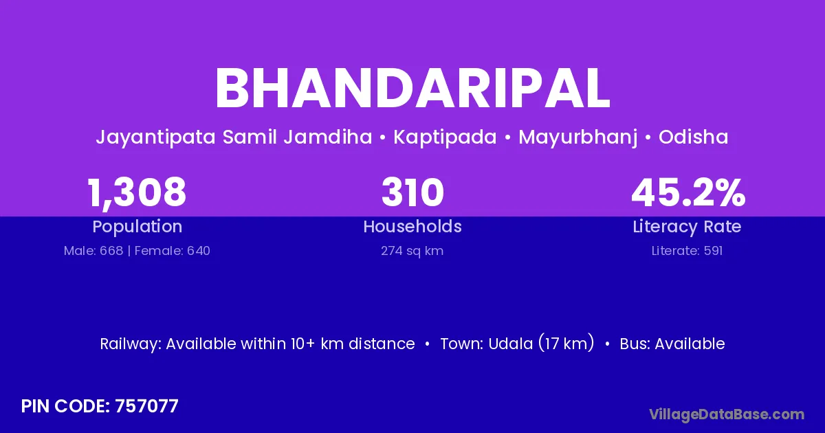 Udala (17 km) is the nearest town to Bhandaripal village for major economic activities and is located approximately 17 km away.