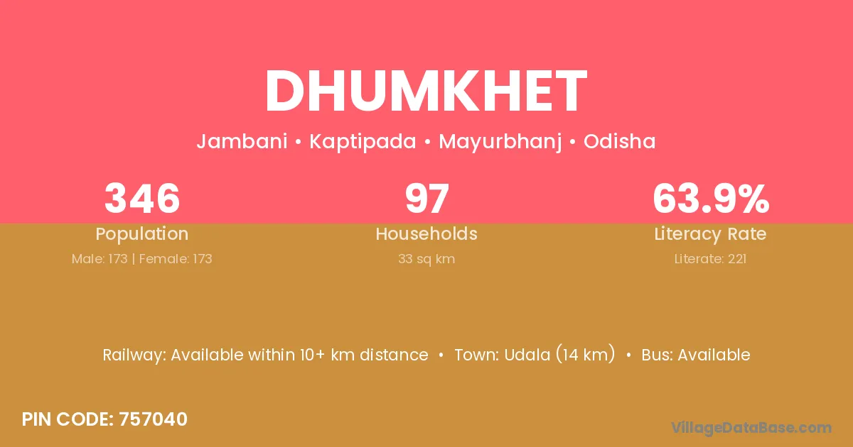 Dhumkhet village has a total population of 346 people, of which 173 are males and 173 are females.