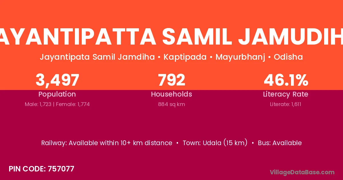 Udala (15 km) is the nearest town to Jayantipatta Samil Jamudiha village for major economic activities and is located approximately 15 km away.