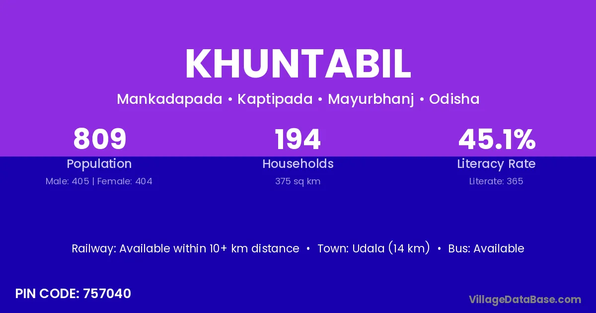Udala (14 km) is the nearest town to Khuntabil village for major economic activities and is located approximately 14 km away.