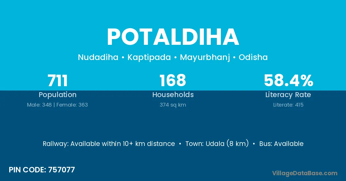 Udala (8 km) is the nearest town to Potaldiha village for major economic activities and is located approximately 8 km away.