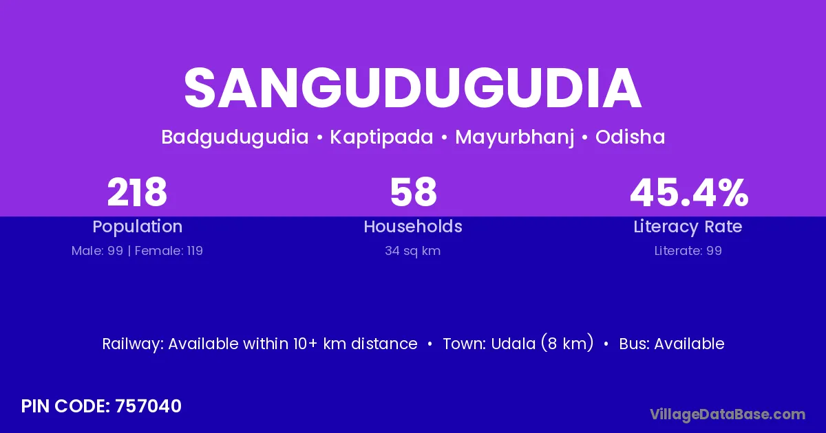 Sangudugudia village has a total population of 218 people, of which 99 are males and 119 are females.
