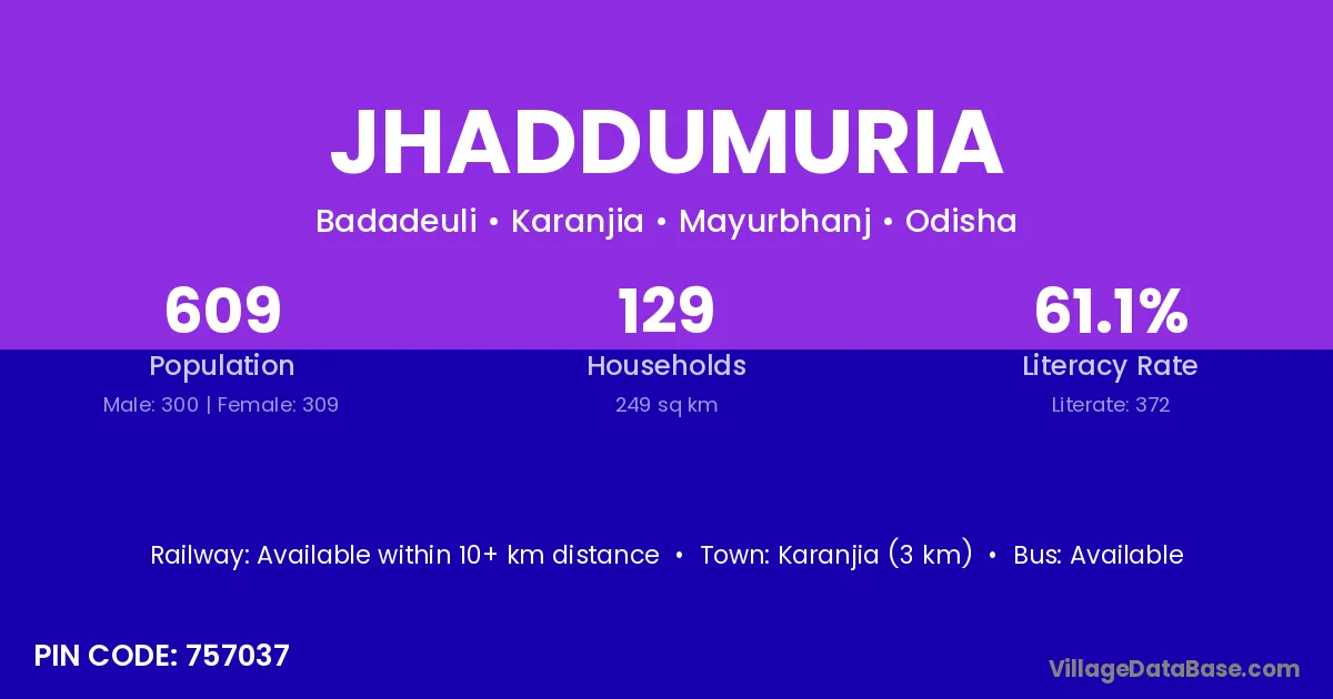 Jhaddumuria village has a total population of 609 people, of which 300 are males and 309 are females.