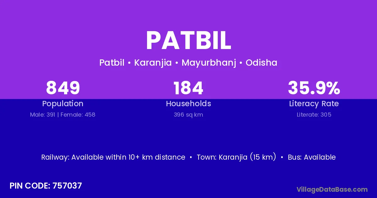 Karanjia (15 km) is the nearest town to Patbil village for major economic activities and is located approximately 15 km away.