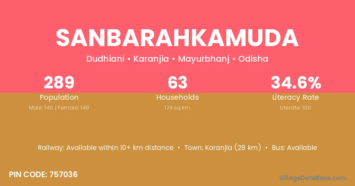 Karanjia (28 km) is the nearest town to Sanbarahkamuda village for major economic activities and is located approximately 28 km away.