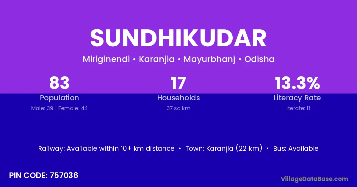 Karanjia (22 km) is the nearest town to Sundhikudar village for major economic activities and is located approximately 22 km away.