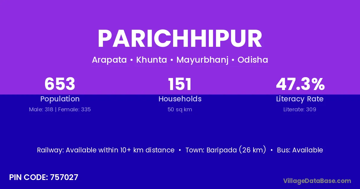 Baripada (26 km) is the nearest town to Parichhipur village for major economic activities and is located approximately 26 km away.