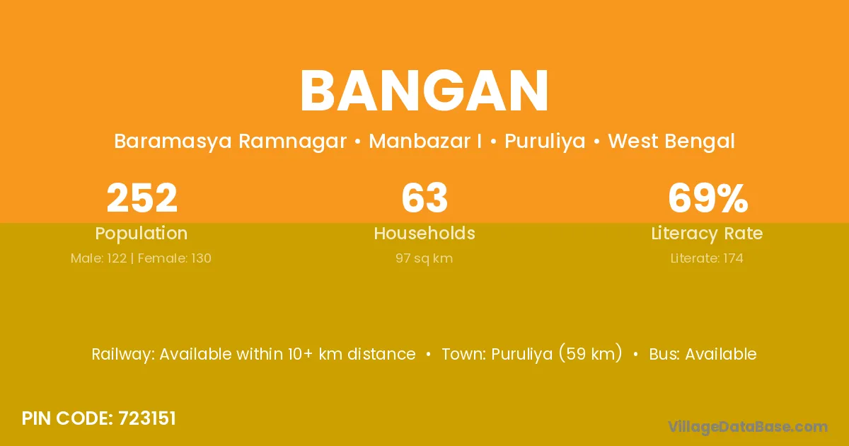 Baripada (21 km) is the nearest town to Bangan village for major economic activities and is located approximately 21 km away.