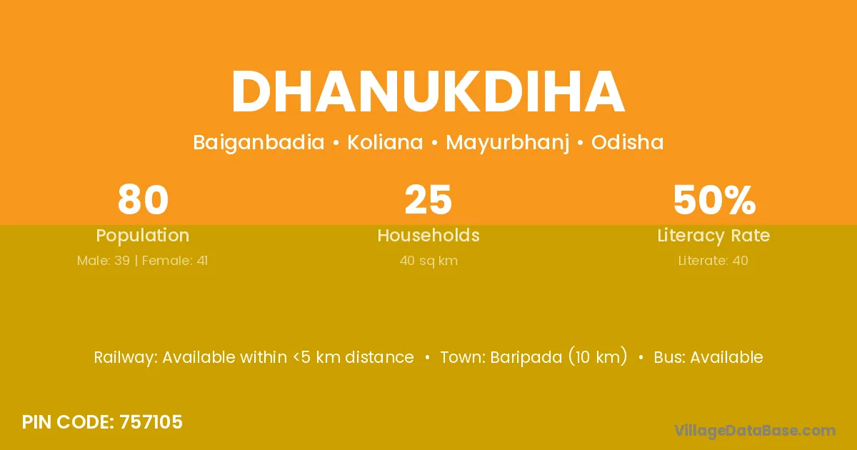 Dhanukdiha village has a total population of 80 people, of which 39 are males and 41 are females.