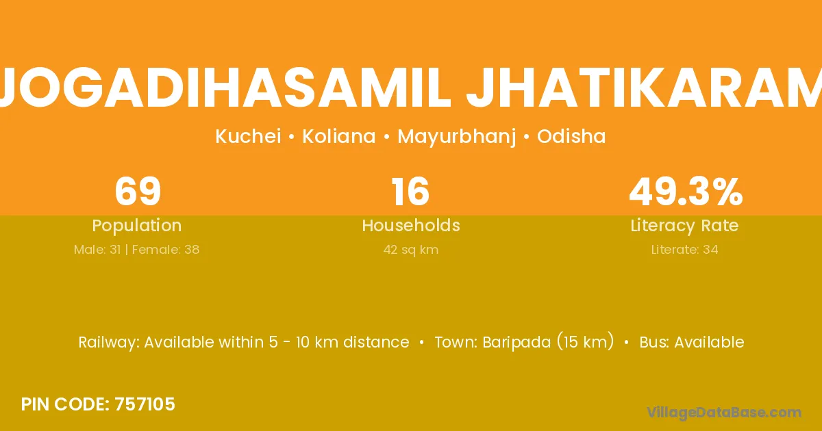 Baripada (15 km) is the nearest town to Jogadihasamil Jhatikaram village for major economic activities and is located approximately 15 km away.