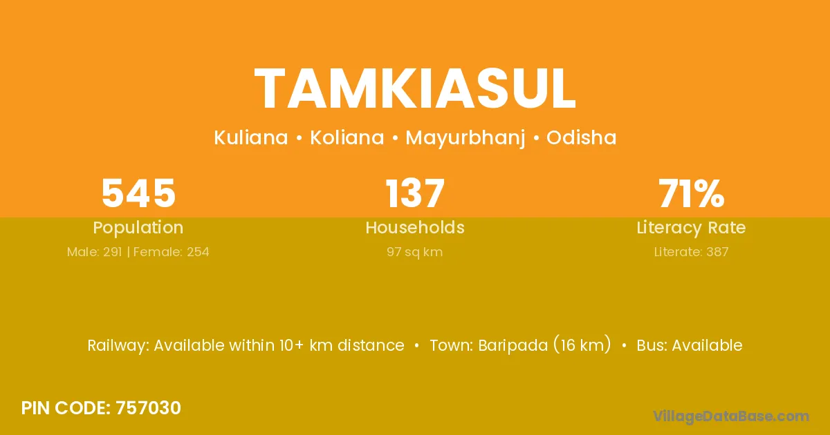 Baripada (16 km) is the nearest town to Tamkiasul village for major economic activities and is located approximately 16 km away.