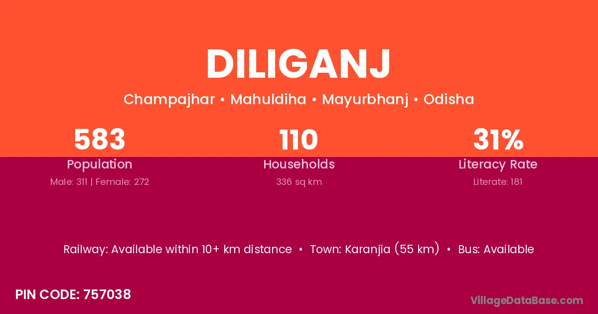 Karanjia (55 km) is the nearest town to Diliganj village for major economic activities and is located approximately 55 km away.